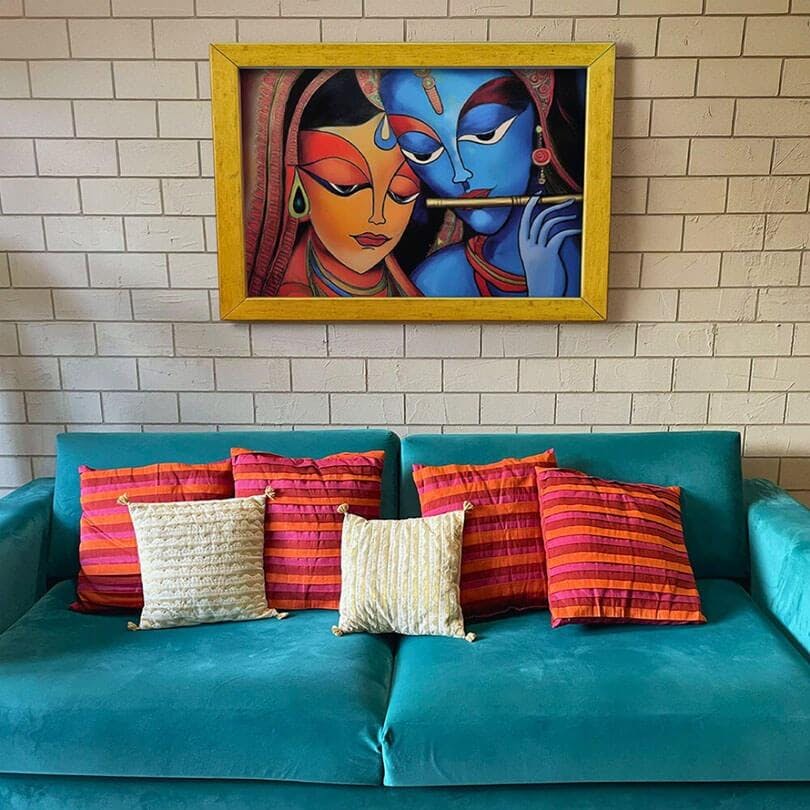 “Devotion” beautifully portrays Radha and Krishna, eternal symbols of divine love and balance. The vivid colors and expressive forms make this modern Krishna painting perfect for creating a serene, romantic energy in your home. Ideal for living rooms, bedrooms, or pooja corners, it celebrates love, connection, and the soulful bond between two energies. A timeless piece for those seeking Radha Krishna wall art, Indian couple paintings, or spiritual love décor.