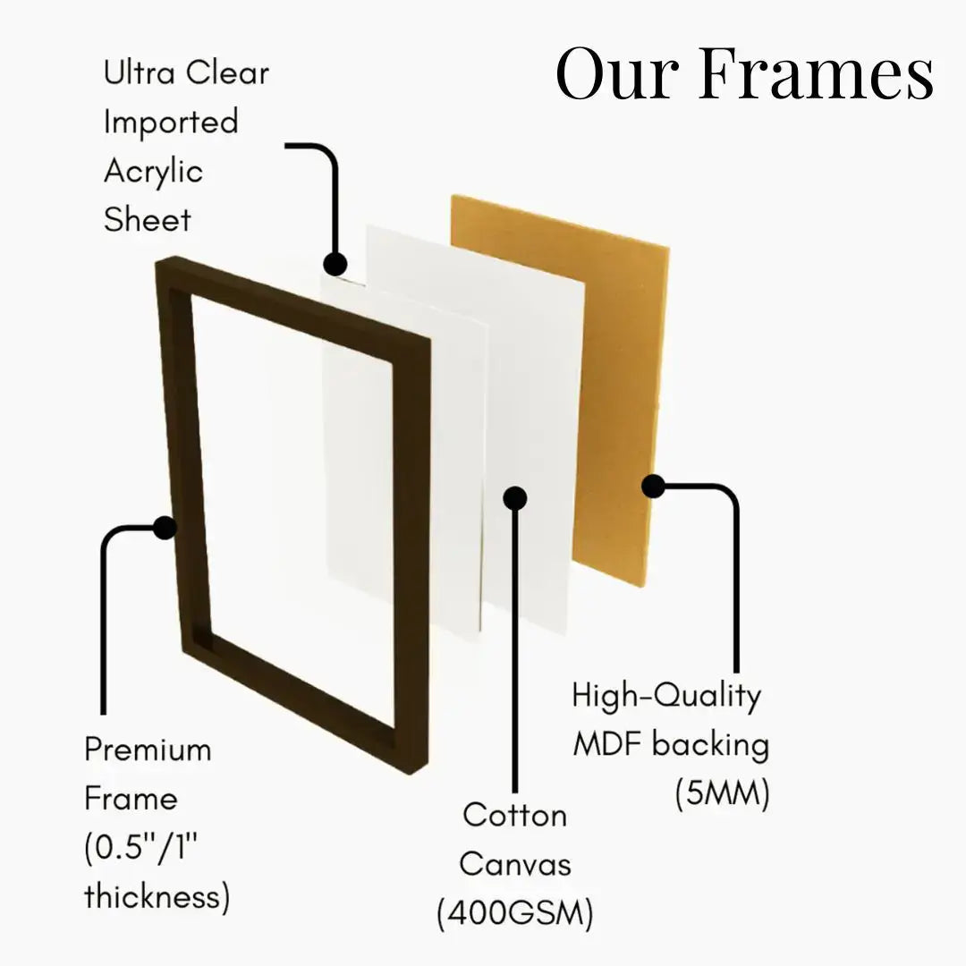 - All our framed art prints are on premium matte paper. We don't use canvas for framed prints because canvas needs to breathe and can't be framed under an acrylic or glass sheet. For framing, we use acrylic instead of glass because it's lighter and more durable, giving you a better and longer-lasting finish